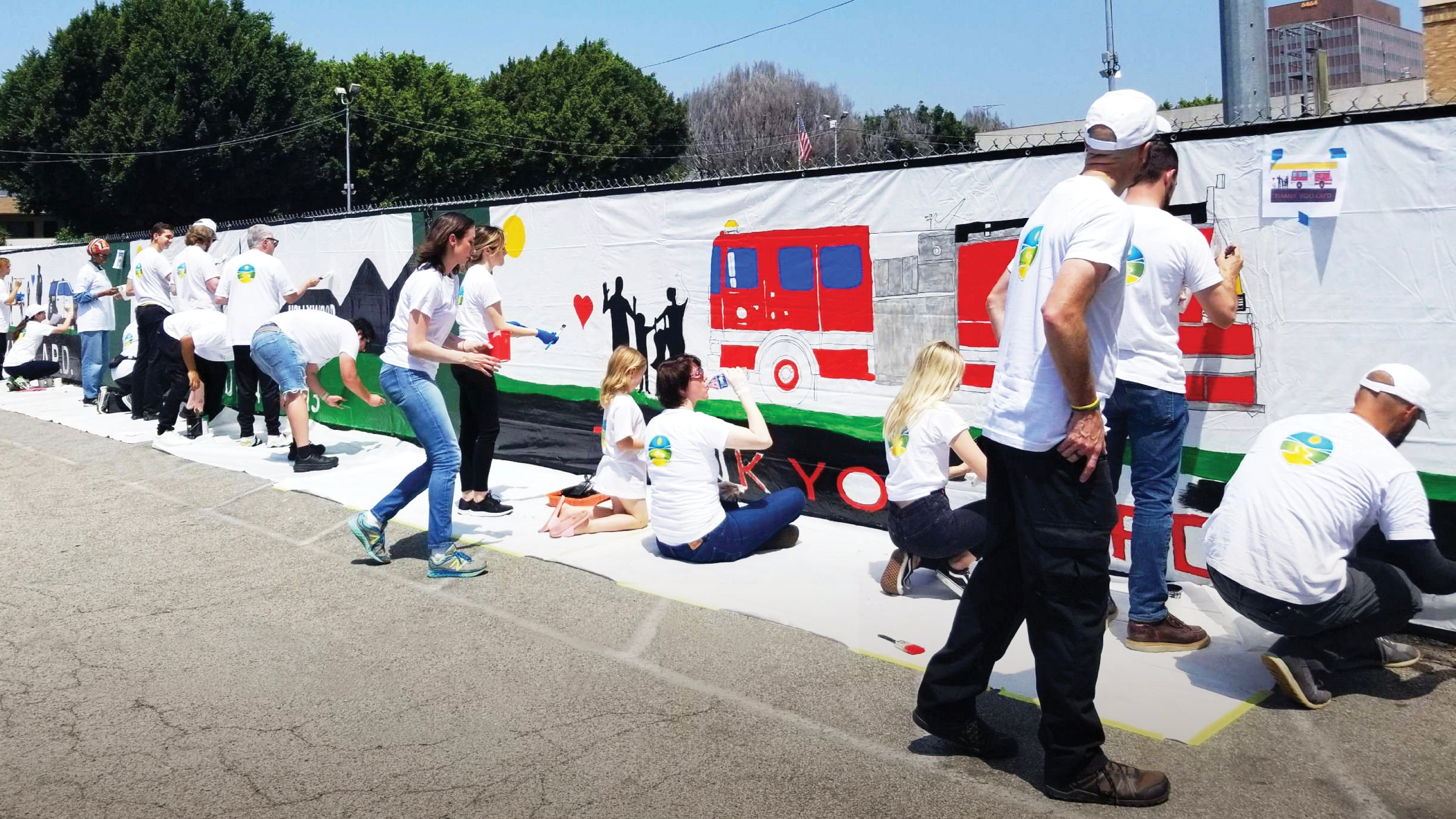 Members of the Los Angeles Fire Department pose in front of one of the completed murals thanking the firefighters for their service to the community.