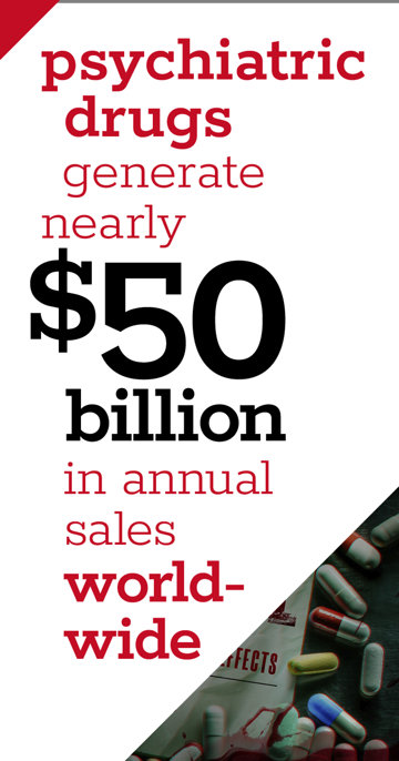Meanwhile, the four major psychotropic drug classes—benzodiazepines, stimulants, antipsychotics and antidepressants—each generate billions of dollars in annual sales. Altogether, psychiatric drugs gross nearly $50 billion per year, feeding a global psychiatric industry valued at well over $400 billion.